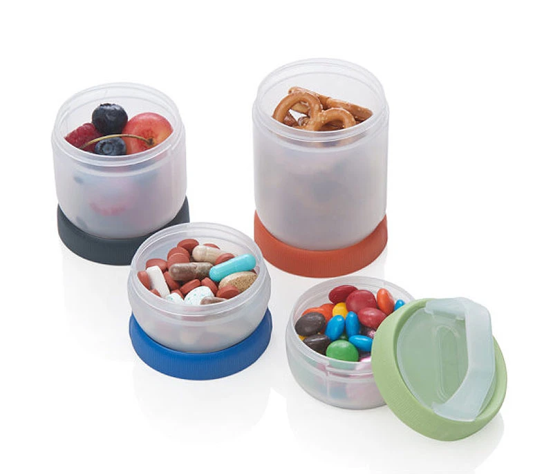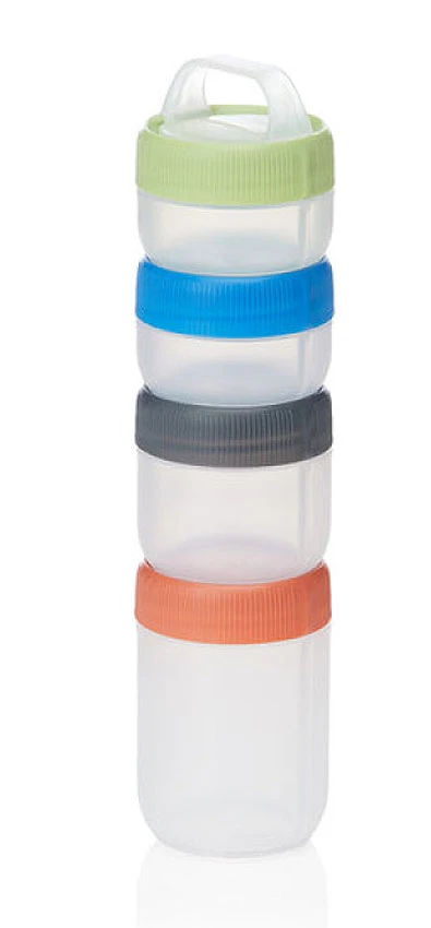 Ein pfiffiges Set zum Aufbewahren von Gewürzen, oder Medikamenten, oder Snacks, oder sonstigem Kleinkram: 4 einzelne Behälter, in 3 Grössen, jeweils mit dichtem Deckel einzeln nutzbar oder mit beliebig vielen Teilen des Sets zu einem Stapelbehälter zu verbinden. Am obersten Deckel kann man einen Clippgriff anbringen, der z.B. beim Herausziehen des Stapels aus einer Tasche/ einem Beutel hilft.