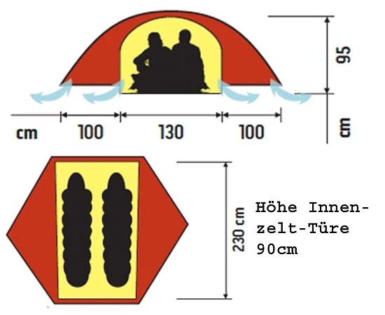 - hoch angesetztes Aussenzelt sorgt für sehr gute Entlüftung – der hochgezogene Innenzeltboden schützt bei kalten Winden und seitlichem Schlagregen