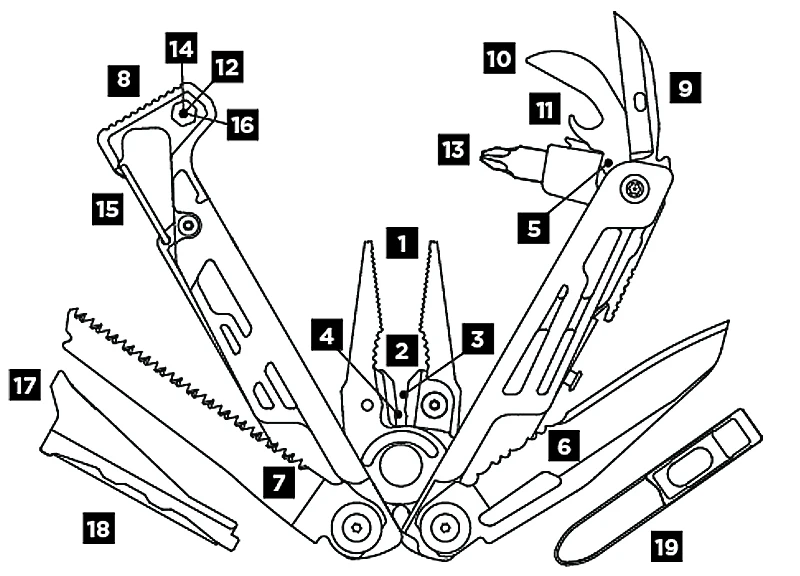 18 – Ferrocerium Feuerstahl (abnehmbar, damit er zusammen mit z.B. der Klinge des Tools genutzt werden kann)