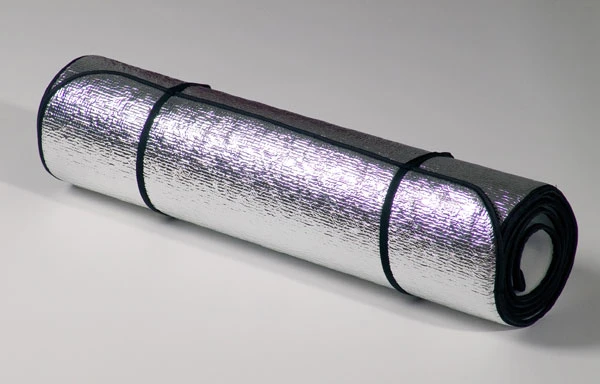Eine isolierende Unterlage mit PE-Schaumeinlage, Alubeschichtung und ‚Unterbodenschutz‘. Sehr gut geeignet als Unterlage am Strand oder Picknick, weniger als Schlafmatte.