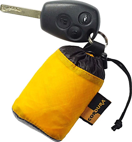 Das wirklich winzige Packmaß – falls Sie es nicht erkannt haben: das Gebilde im 2.Detailbild ist ein Autoschlüssel, an dem die verpackte Bag hängt… verbietet Ausreden, warum denn keine Einkaufstasche dabei ist und wieder im Supermarkt nach einem ´Tütchen´ gefragt werden muss.